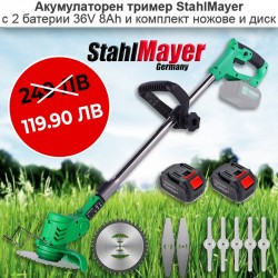 ГАРАНЦИЯ 24 МЕСЕЦАНемски Акумулаторен Тример Косачка за Трева STAHLMAYER 36V 8.0AHГрадински Тример от ново поколение STAHLMAYER !Мощен лек и перфектно балансиран тример за трева. Телескопичната дръжка може да се регулира точно според височината и обхвата на потребителя.Ергономично оформената дръжка ..
