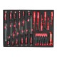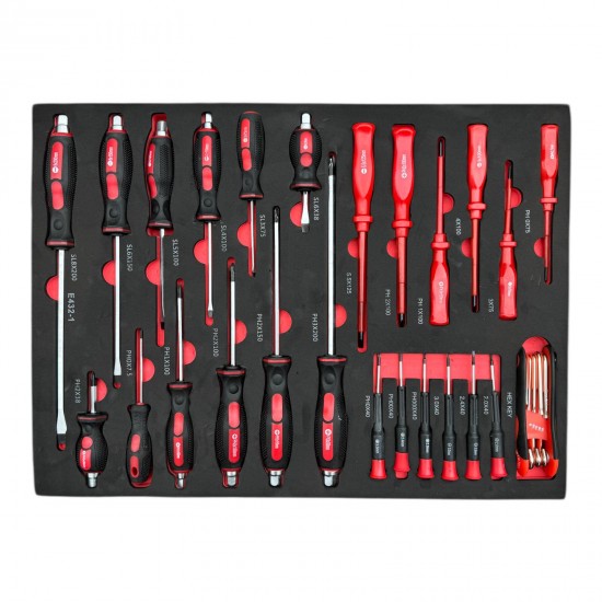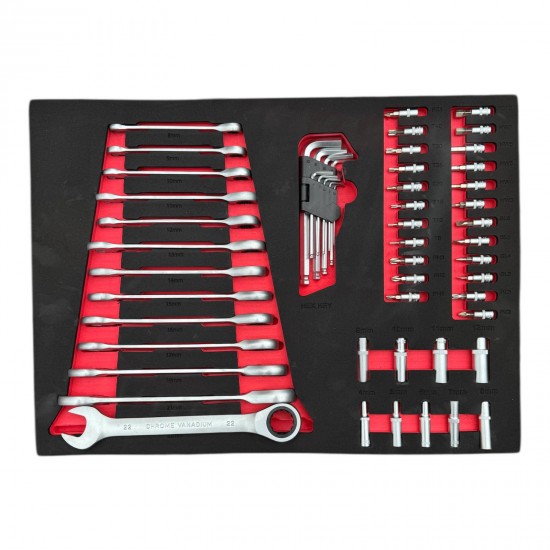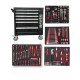 Шкафът разполага с 6 чекмеджета, от които 4 са напълно окомплектовани с инструменти, подредени в маслоустойчива EVA пяна за перфектна организация и защита. Оборудван е с централно заключване за сигурност и лагерни водачи на чекмеджетата, осигуряващи плавно и безпроблемно отваряне. Допълнителното странично отделение за масла и консумативи предлага повече удобство и пространство за съхранение.