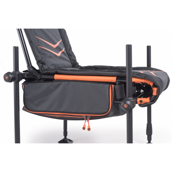 Удобен, перфектно стабилен и лесен за транспортиране – това е Feeder Station TMX. Ергономичният дизайн на седалката и облегалката, заедно с добре подплатения матрак, гарантират комфортно седене. Четирите регулируеми крака се адаптират към всякакъв неравен терен, а вграденото нивелирно нивелирче ви позволява бързо да настроите седалката перфектно нивелирана. На стръмни брегове ще оцените предните телескопични крака и висококачествените въртящи се кални крачета, които предотвратяват потъването. Под седалката има голям отдел за съхранение, идеален за съхранение на странични тавички, стойки за пръчки и други аксесоари. По време на транспортиране, краката могат да бъдат поставени в специални държачи в закръглената предна част на седалката. Облегалката може лесно да се сгъне и закрепи на място с предоставената скоба. Също така е включена регулируема презрамка за носене.